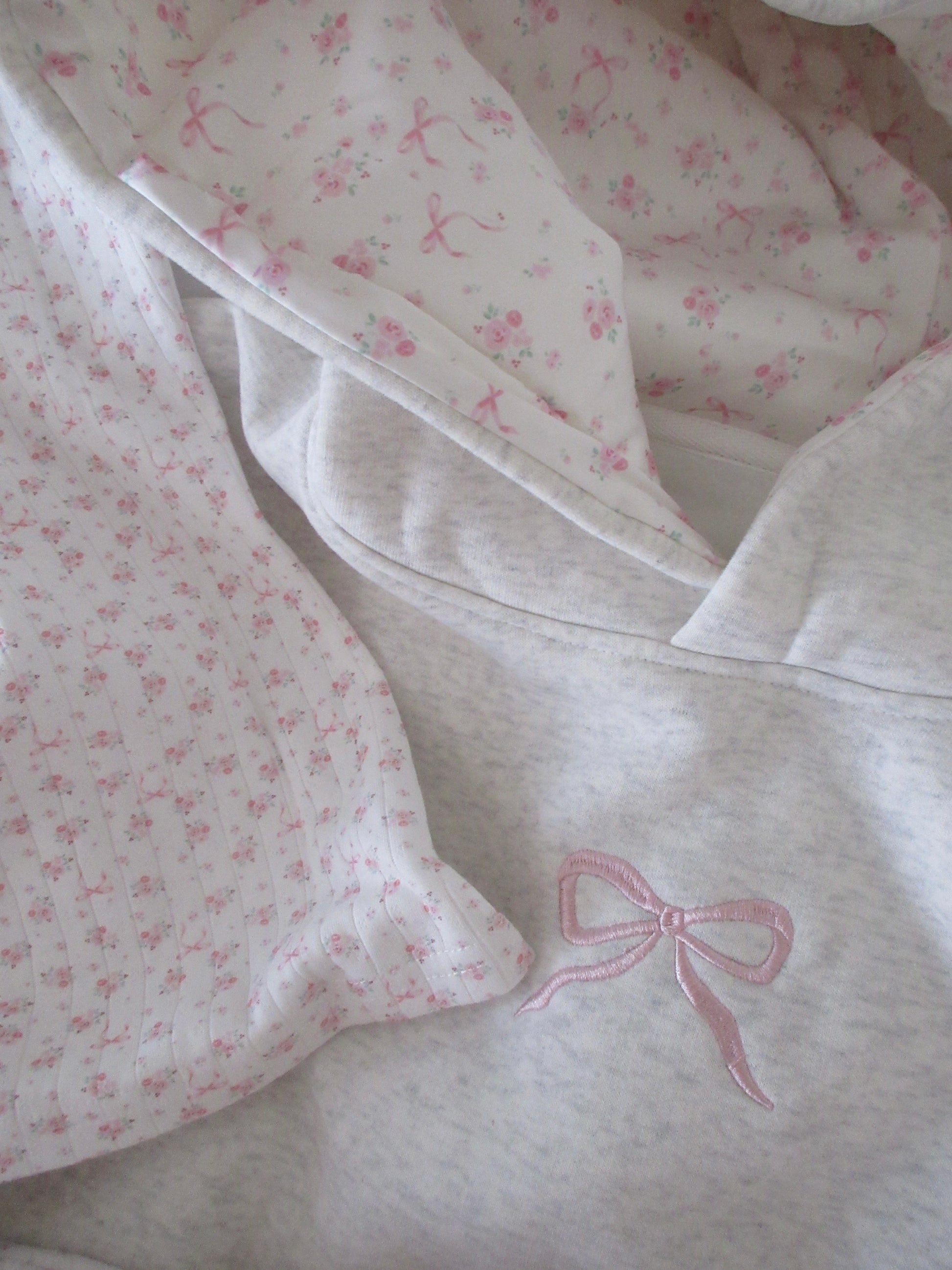 This soft cotton tank features delicate spaghetti straps topped with lace trim and a tiny white bow. Entirely detailed with blush pink bows and adorable floral bouquets.