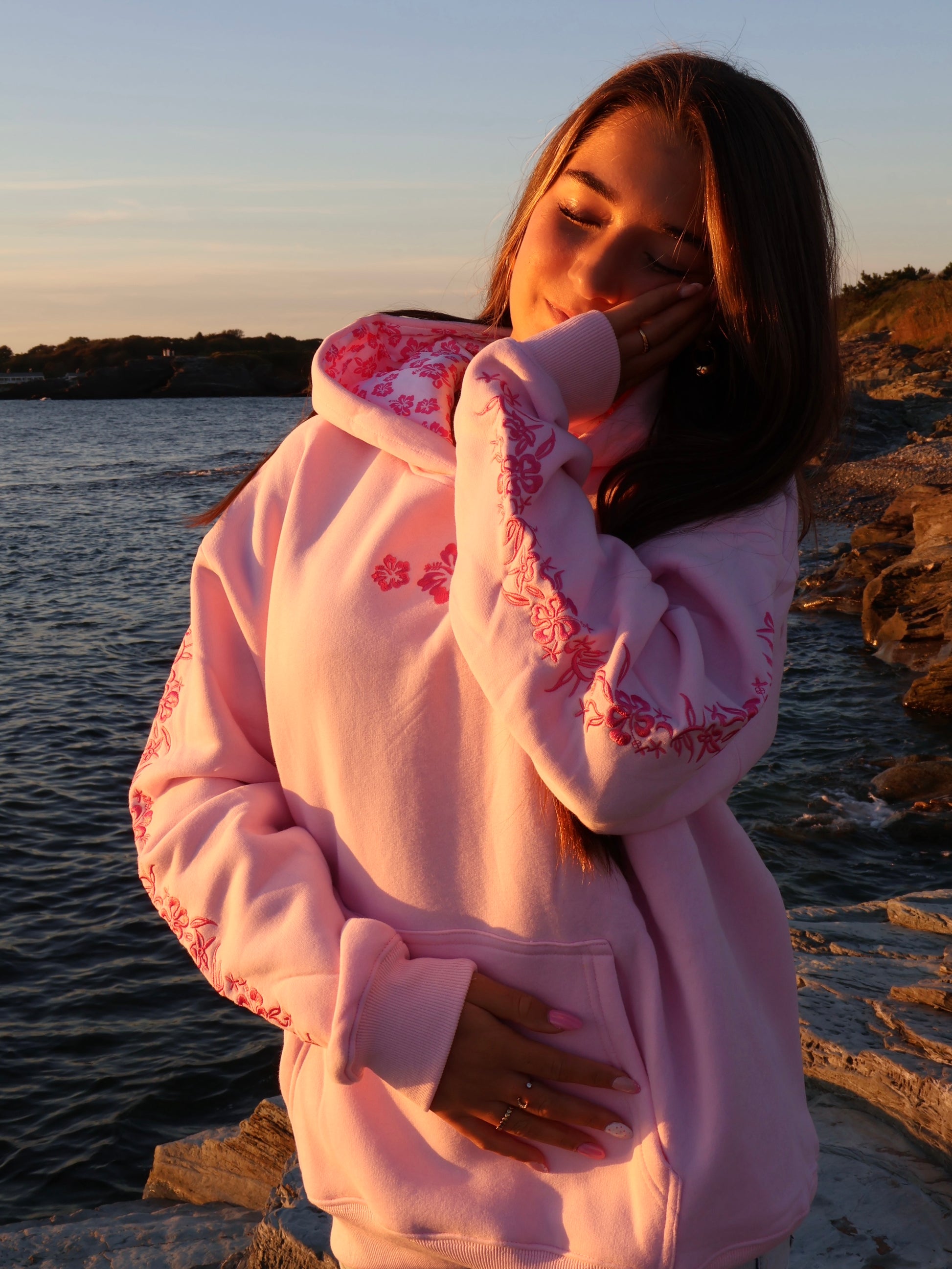 Soft baby pink hoodie with three pink hibiscus flowers embroidered on the chest. Floral vines embroidered down each sleeve. Satin hood lining detailed with pink hibiscus flowers. Our satin lining adds a touch of elegance while protecting your hair from frizz. Drop shoulder, relaxed, and cozy fit. The comfiest and softest hoodie you'll own!