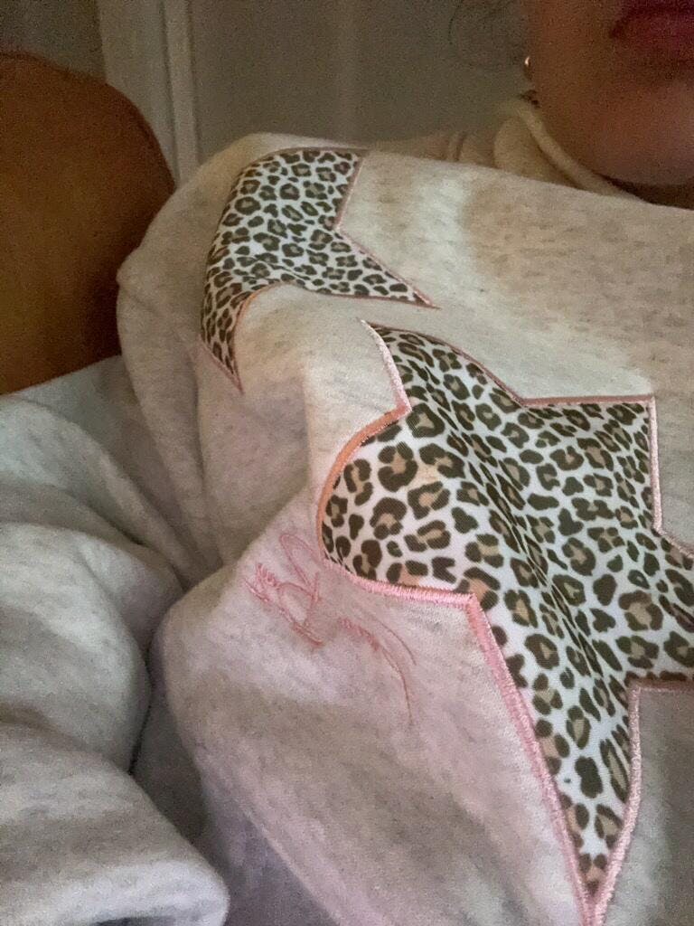 Soft, heather grey hoodie with two satin leopard star patches across the chest, embroidered in baby pink thread. Satin hood lining detailed with light brown leopard print. Drop shoulder, relaxed, and cozy fit. The comfiest and softest hoodie you'll own!
