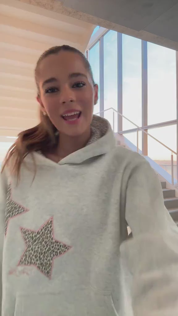 Soft, heather grey hoodie with two satin leopard star patches across the chest, embroidered in baby pink thread. Satin hood lining detailed with light brown leopard print. Drop shoulder, relaxed, and cozy fit. The comfiest and softest hoodie you'll own!