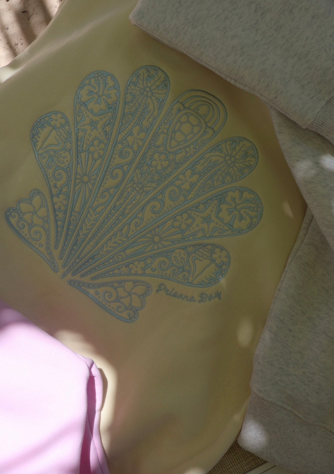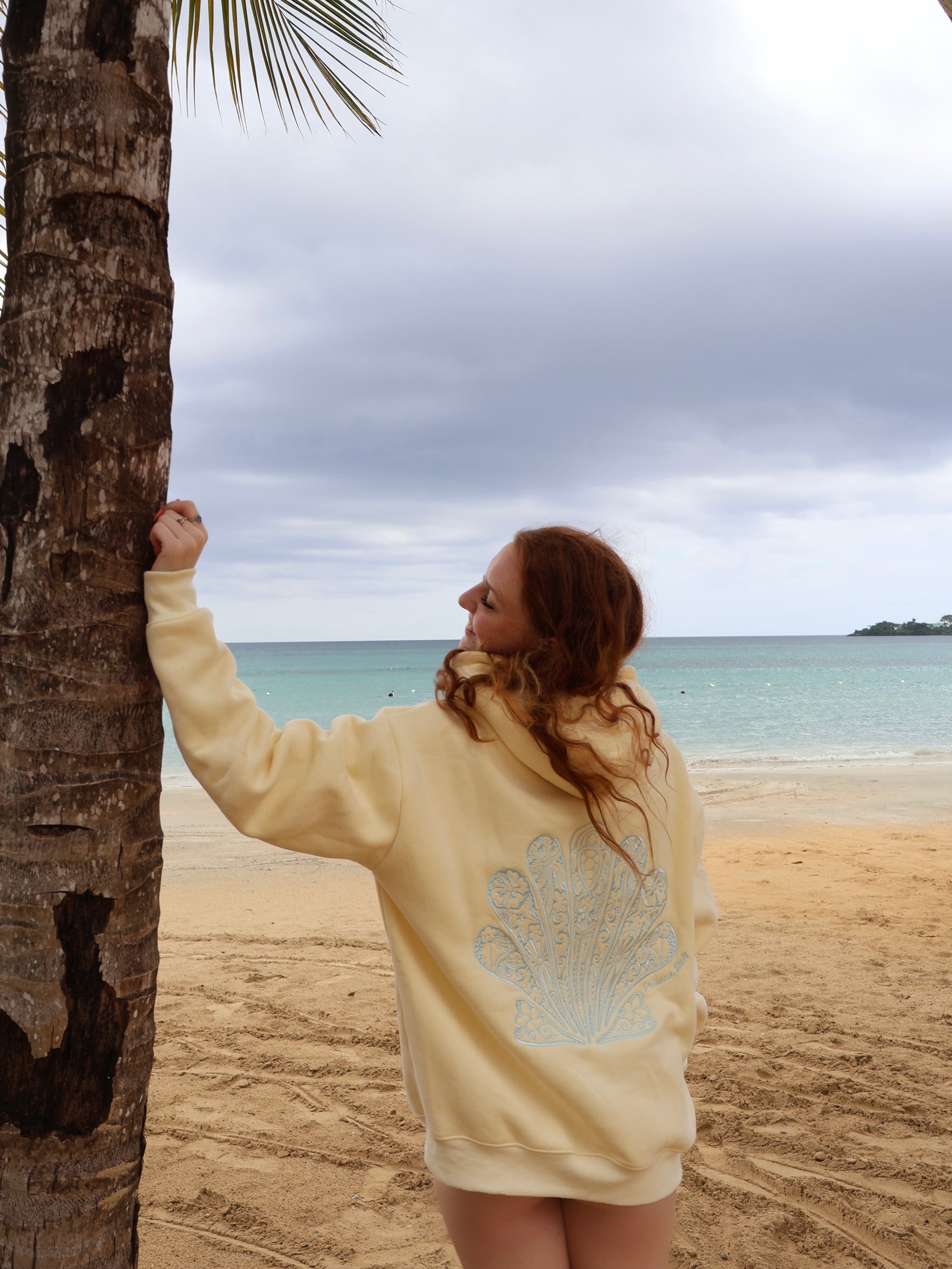 Soft baby yellow hoodie featuring blue embroidery on the chest and back. The front has an embroidered stripe detailed with seashells, tropical flowers, and coral. The back showcases a beautiful seashell filled with illustrations of sea life, all inspired by the beach. Designed for comfort, made to stand out, and perfect for everyday wear. This hoodie features original hand-drawn artwork made to capture the feeling of coastal paradise.