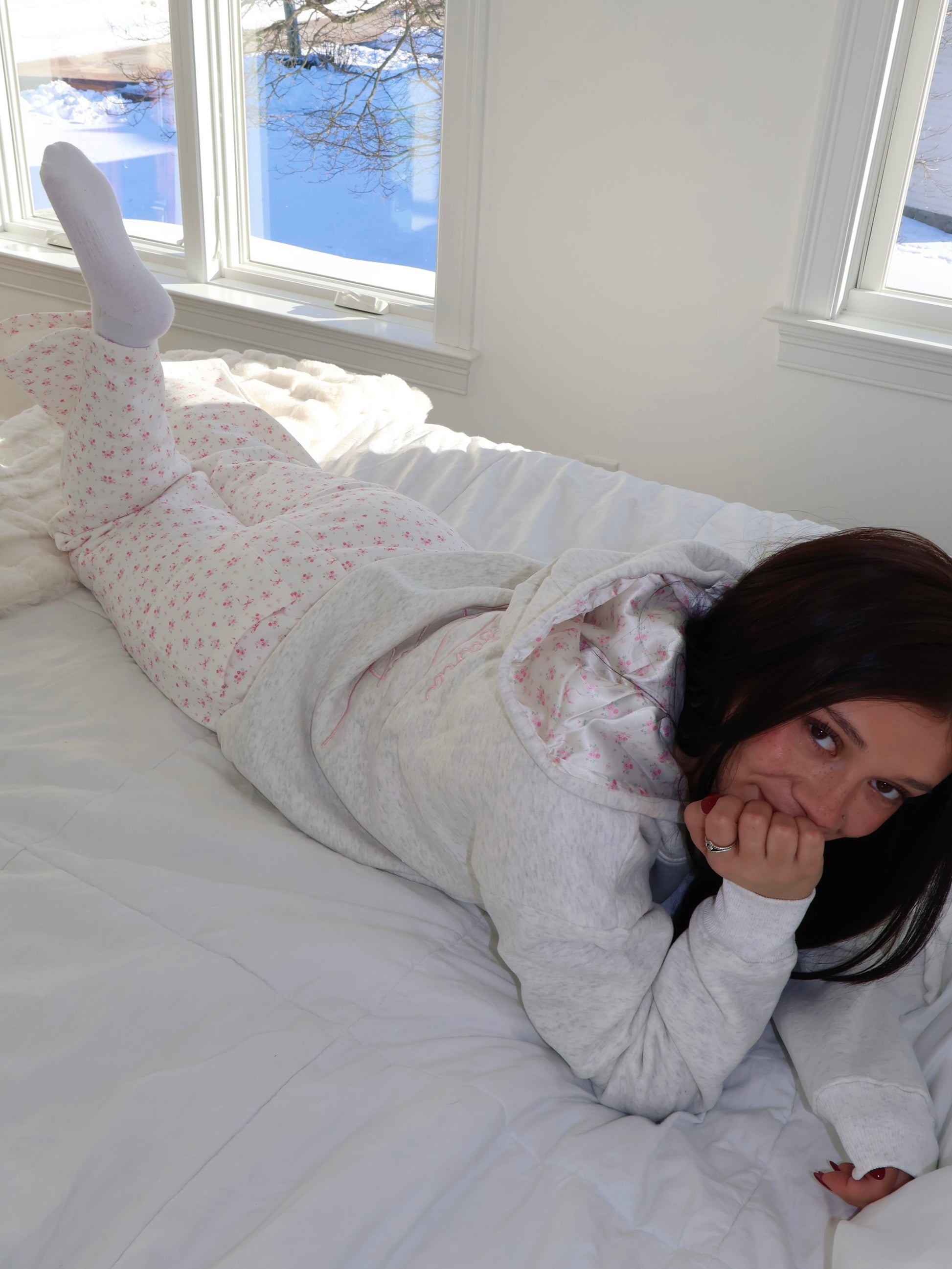 Cozy wide-leg lounge pants with a relaxed fit. Entirely detailed with blush pink bows and adorable floral bouquets. Designed to complete the Bow Hoodie set, featuring the same signature pattern as our satin bow hood lining. Stretchy fold-over waistband with an adjustable inner drawstring. You can wear the strings tucked in or let them show. Features deep side pockets and one back pocket.