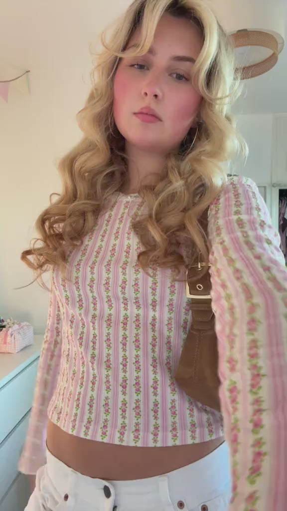 Fitted white long sleeve top, detailed with pink stripes and roses. This top includes a delicate lace trim and a tiny white bow.